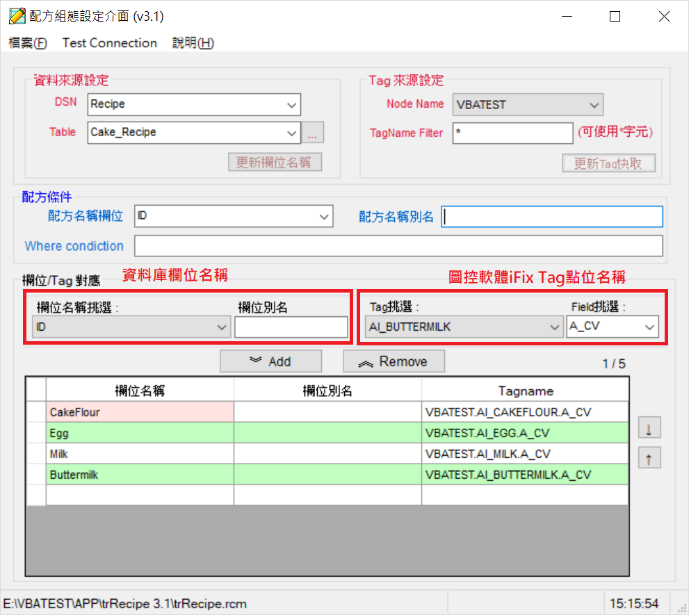 產品特色- 設定簡易,僅需於配方管理介面設定點位與關聯式資料庫欄位對應表,就能針對生產需求批次管理配方內容。