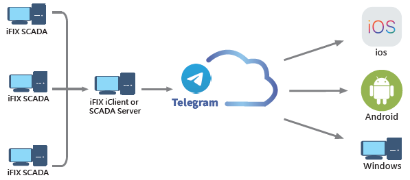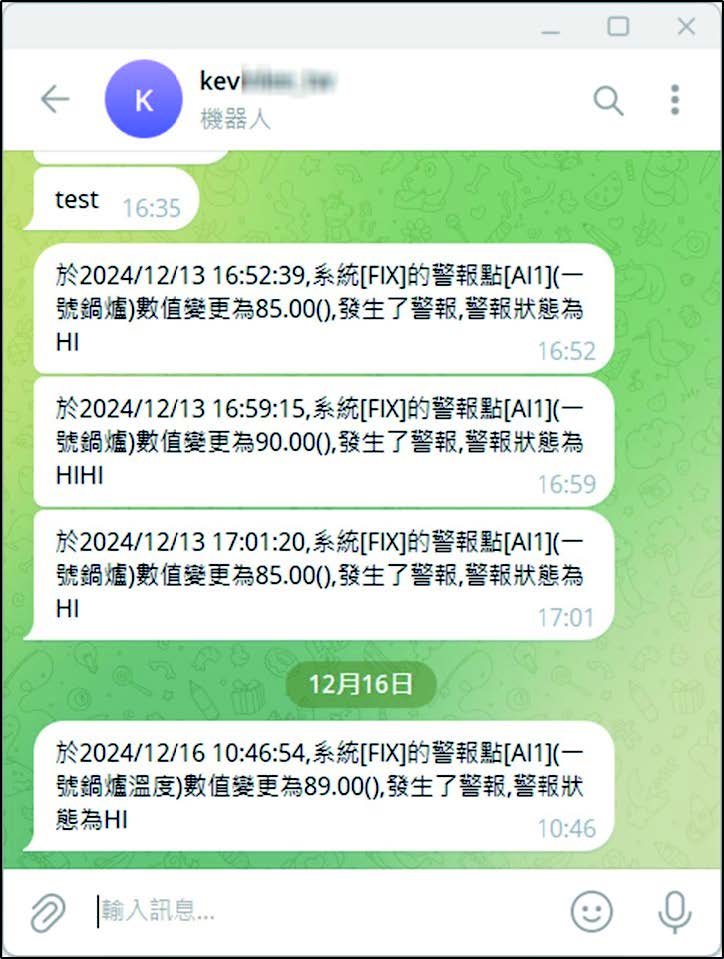 Telegram 行動告警能夠立即接收 iFIX SCADA 系統警報訊息,主動通知系統操作人員警報狀態。
